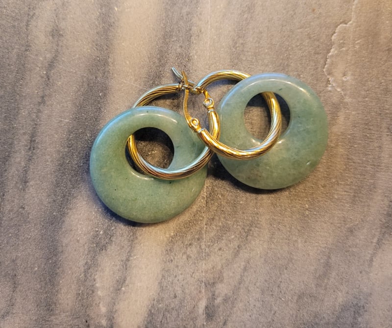 Deze prachtige Aventurijn donuts hangen aan een rvs goudkleurige creool