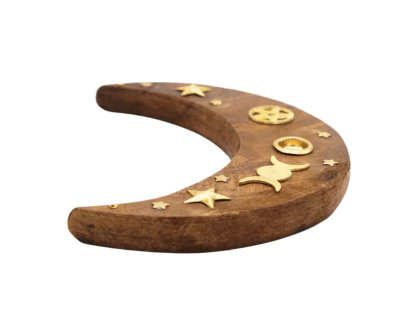 Prachtige magische wierhouder van mangohout in de vorm van een halve maan.
